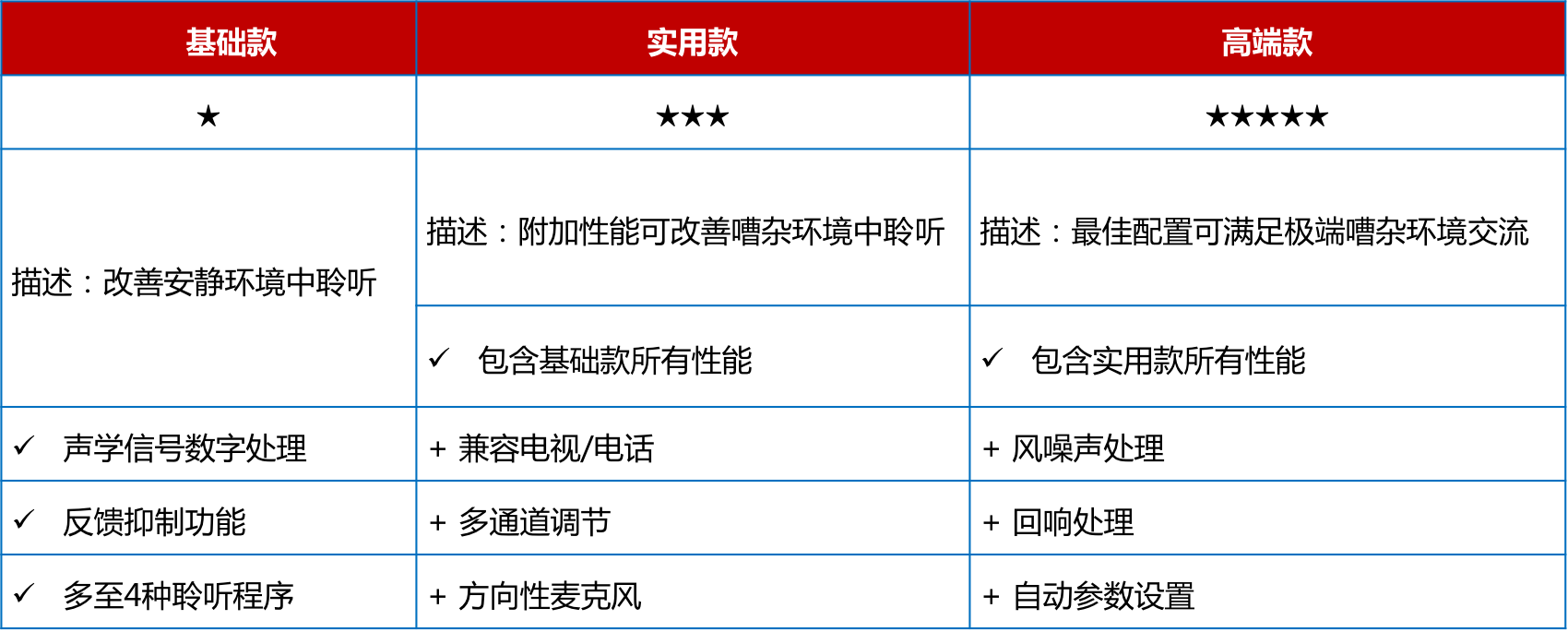 <span style="font-size:16px;"> 助聽器價(jià)格取決于機(jī)器的檔次,而檔次由內(nèi)含的技術(shù)種類決定。助聽器檔次大致可分為基礎(chǔ)款、實(shí)用款、高端款。這三種檔次的區(qū)別請(qǐng)參見下表:</span></p><p style="text-align: center;"><span style="font-size:16px;"><img src="/upfiles/201808150226553383.png" width="640" alt="" /><br /></span></p><p><span style="font-size:16px;"> 那么,如何應(yīng)該選擇哪種檔次的助聽器呢?</span></p><p><span style="font-size:16px;"> 選擇助聽器時(shí)主要需要考慮兩大因素。首先要考慮的就是弱聽人士的聽力損失程度,其次要考慮的就是弱聽人士的日常生活方式。比方說,某位弱聽人士是中度聽力損失,日常在家為主,那么實(shí)用款檔次助聽器通常可以滿足TA的需求。</span></p><p><span style="font-size:16px;"> 當(dāng)然,這里只是為助聽器選配提供了大致方向,如何選配仍然需要具體情況具體分析,最好還是需要跟驗(yàn)配師面對(duì)面溝通。</span></p><p><span style="font-size:16px;"> 1、高端款助聽器</span></p><p><span style="font-size:16px;"> 不同廠家的高端款助聽器均代表了各自的尖端技術(shù),并致力于提供最佳的音質(zhì)。</span></p><p><span style="font-size:16px;"> 這類助聽器高端之處在于自動(dòng)適應(yīng)各種聆聽環(huán)境,最優(yōu)化佩戴者的聆聽清晰度和舒適度,讓佩戴者在極度嘈雜的環(huán)境中,如咖啡館,也能清晰地聽到同伴的言語聲。常見性能包括:</span></p><p><span style="font-size:16px;"> (1) 多種外觀、顏色可選;</span></p><p><span style="font-size:16px;"> (2) 環(huán)境自適應(yīng);</span></p><p><span style="font-size:16px;"> (3) 360°信號(hào)追蹤;</span></p><p><span style="font-size:16px;"> (4) 兼容各種藍(lán)牙設(shè)備。</span></p><p><span style="font-size:16px;"> 高端款助聽器為什么能夠自動(dòng)適應(yīng)各種聆聽環(huán)境呢?這是因?yàn)樽笥覂蓚?cè)的高端款助聽器能夠相互“通電報(bào)”,精準(zhǔn)判斷所處的聆聽環(huán)境并自主學(xué)習(xí),給出最佳的助聽設(shè)置。</span></p><p><span style="font-size:16px;"> 比如,您經(jīng)常出入一家書店,每次您進(jìn)入這家書店時(shí)總是習(xí)慣性地將音量調(diào)低2分貝;長此以往,當(dāng)您再次進(jìn)入該書店時(shí),兩臺(tái)助聽器將會(huì)默契地降低2分貝。</span></p><p><span style="font-size:16px;"> 360°信號(hào)追蹤可以幫助佩戴者建立更佳的空間感知,對(duì)所處環(huán)境有充足的把控和預(yù)判,避免一些潛在的危險(xiǎn)。而當(dāng)助聽器連接至各種藍(lán)牙設(shè)備時(shí),聆聽清晰度會(huì)更高,且不會(huì)打擾其他人。</span></p><p><span style="font-size:16px;"> 比如家人總是抱怨您把電視機(jī)聲音開得太大,拒絕跟您一起觀看電視時(shí),您可以選配能夠兼容電視的助聽器,并進(jìn)行獨(dú)立的音量調(diào)節(jié),而家人只需設(shè)置為常規(guī)音量即可。高端款助聽器的價(jià)位一般在15000以上。</span></p><p style="text-align: center;"><span style="font-size:16px;"><img src="/upfiles/201808150228328500.jpg" alt="" /><br /></span></p><p><span style="font-size:16px;"> 2、實(shí)用款助聽器</span></p><p><span style="font-size:16px;"> 實(shí)用款助聽器的價(jià)格一般在8000~15000之間。實(shí)用款助聽器包含一定的降噪技術(shù)和言語提升功能,可以滿足大多數(shù)環(huán)境中的聆聽需求。部分廠家的實(shí)用款助聽器也可兼容各種藍(lán)牙設(shè)備。實(shí)用款助聽器的突出性能大致包括:</span></p><p><span style="font-size:16px;"> (1) 可連接外接音源;</span></p><p><span style="font-size:16px;"> (2) 言語清晰度提升;</span></p><p><span style="font-size:16px;"> (3) 方向性功能。</span></p><p><span style="font-size:16px;"> 3、基礎(chǔ)款助聽器</span></p><p><span style="font-size:16px;"> 基礎(chǔ)款助聽器的價(jià)位一般在8000以下。基礎(chǔ)款助聽器能夠滿足安靜環(huán)境中的交流需求,并具備反饋管理功能。反饋管理功能能夠有效提升佩戴舒適度,避免在日常佩戴過程中出現(xiàn)尖銳的干擾聲。</span></p><p><span style="font-size:16px;"> 基礎(chǔ)款助聽器適用于經(jīng)常在家的弱聽人士,若是生活方式比較豐富多彩的弱聽人士建議選配其他檔次的助聽器。實(shí)用款助聽器的突出性能大致包括:</span></p><p><span style="font-size:16px;"> (1) 數(shù)字信號(hào)處理技術(shù);</span></p><p><span style="font-size:16px;"> (2) 反饋管理功能;</span></p><p><span style="font-size:16px;"> (3) 多種聆聽程序可選。</span></p><p><span style="font-size:16px;"> 更多詳情請(qǐng)登錄m.hnghng.cn。</span></p>" />