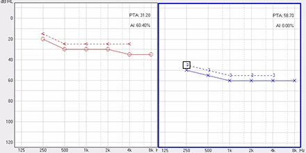 <span style="font-size:16px;"> 純音聽閾測試是聽力學所有測試項目中最基本的一項內容,包括氣導(AC)、骨導(BC)、最舒適閾(MCL)與不舒適閾(UCL)測試。測試結果能夠直接反映患者雙耳的聽力損失程度、性質與動態范圍,還能夠間接反映患者的患病位置、病因與助聽后效果。</span></p><p><span style="font-size:16px;"> 一般地,整個檢查控制在10分鐘左右,既能全面做完檢查,又不至患者疲憊而影響主觀反應。</span></p><p><span style="font-size:16px;"> 純音聽閾測試是最考驗聽力學工作者實際工作能力的一項基本內容:</span></p><p><span style="font-size:16px;"> 1、若患者曾長期暴露于噪聲中,且無其它致聾因素,很可能在3 kHz或6 kHz出現明顯的下降,聽力曲線呈現“V”字形,所以除了常規的倍頻程頻率外,還要加測這兩個頻率,否則就犧牲了多通道助聽器的意義;</span></p><p><span style="font-size:16px;"> 除了有過噪聲接觸史的患者需要加測半倍頻程外,涉及聲場助聽聽閾評估、賠償等情況都需要加測半倍頻程。</span></p><p><span style="font-size:16px;"> 耳鳴困擾的患者,注意避免與耳鳴聲類似的純音,若還用純音作為刺激聲,患者就會分辨不清,出現假陽性或假陰性。所以,測試者要換成囀音,既有別于耳鳴聲,又具有頻率特異性。</span></p><p><span style="font-size:16px;"> 2、不舒適閾反映患者對大聲的忍耐力,不舒適閾與氣導的差值能顯示患者的動態范圍,指導驗配師調節助聽器的最大輸出。</span></p><p><span style="font-size:16px;"> 不舒適閾測試頻率是否越多越好呢?非也。測得頻率過多,一會引起患者疲勞或不適,二是沒必要,大多數助聽器的最大輸出是一個整體,不能像調增益和壓縮那樣分通道,所以測多了并無好處,一般測0.5、1、2、4 kHz。</span></p><p><span style="font-size:16px;"> 3、如果兩側聽力有明顯差異,此時就要準備好掩蔽了,分為氣導掩蔽與骨導掩蔽。</span></p><p><span style="font-size:16px;"> (1)氣導掩蔽的判斷有兩個原則,只要符合其中一個原則,就需要重新測差耳氣導。具體做法是:</span></p><p><span style="font-size:16px;"> 測試完雙耳氣導,若發現某一頻率差耳氣導閾值比好耳氣導閾值多40 dB以上就要懷疑有可能是好耳偷聽的,需要給好耳氣導加掩蔽聲;</span></p><p><span style="font-size:16px;"> 測試完雙耳氣導與好耳骨導,若發現某一頻率差耳氣導閾值比好耳骨導閾值多40 dB以上就要懷疑有可能是好耳偷聽的,需要給好耳氣導加掩蔽聲。</span></p><p><span style="font-size:16px;"> 下面為未掩蔽的聽力圖:</span></p><center><span style="font-size:16px;"><img alt="" src="/upfiles/201810160133207570.png" width="440" height="220" /></span></center><p></p><p><span style="font-size:16px;"> 下圖為掩蔽后的左耳真實氣導值:</span></p><center><span style="font-size:16px;"><img alt="" src="/upfiles/201810160133289538.png" width="440" height="220" /></span></center><p></p><p><span style="font-size:16px;"> (2)骨導掩蔽的判斷原則:</span></p><p><span style="font-size:16px;"> 測試完雙耳氣導與好耳骨導,若發現某一頻率差耳氣導閾值比好耳骨導閾值大于等于15 dB就必須予以掩蔽,重測骨導。下圖為右耳氣導加掩蔽后左耳骨導的真實值:</span></p><center><span style="font-size:16px;"><img alt="" src="/upfiles/201810160133368026.png" width="440" height="220" /></span></center><p></p><p><span style="font-size:16px;"> 注意:</span></p><p><span style="font-size:16px;"> 1)掩蔽的規則要按順序適用;</span></p><p><span style="font-size:16px;"> 2)各頻率根據規則決定是否需要加掩蔽;</span></p><p><span style="font-size:16px;"> 3)很少需要掩蔽所有頻率,通常氣導掩蔽頻率不應超三個,骨導掩蔽頻率不應超兩個,否則受試者會疲憊不堪。</span></p><p><span style="font-size:16px;"> 醫院測聽的主要目的是診斷和鑒別聽力損失的性質和程度,驗配中心的主要目的是盡可能地幫助患者選擇并調試好助聽器。</span></p><p><span style="font-size:16px;"> 更多詳情請登錄m.hnghng.cn</span></p>" />