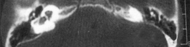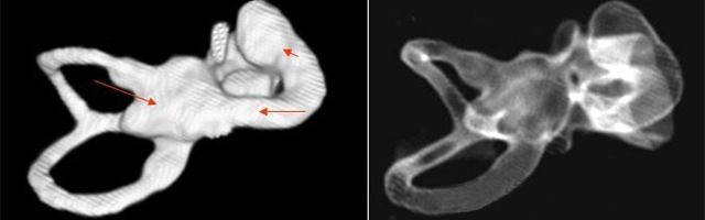 雙側內耳畸形:左側無內耳迷路及內耳道機構,為米歇爾畸形;右側空耳蝸及前庭擴大,為先天性耳蝸畸形