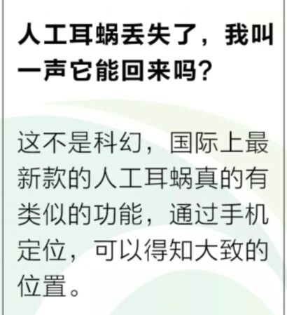 2019年4月10日這是一個新型的欄目<br /> 一本正經地奇思妙想<br /> 內容全靠一張圖<br /> 言語僅僅三兩句<br /> 大家隨便看看就行了<br /> 可一定得往心里去啊<br /><br /></span><div style="text-align: center;"><img src="/upfiles/20190410093258759.jpg" alt="" /></div> 嚴肅點:幾乎每個月,都有人工耳蝸丟失的事件發生,每一次都會成為該地方新聞的焦點。<br /> 無論我們多么小心,不經意間的疏忽總會造成大麻煩。對于遺失耳蝸的家庭來說,一方面要承擔一筆不少的購機費用,另一方面會有一段時間的“聽力真空期”,我們不禁感嘆,要是耳蝸能自己報告位置就好了。<br /> 實際上這并非空想,國際某品牌人工耳蝸的最新設備已經可以實現遺失位置定位,通過手機,我們可以找到處理器所在的大致位置(如果你有興趣,可以留言交流)。<br /> 5G時代,萬物互聯,遺失定位也是未來人工耳蝸產品設計的趨勢之一,未來小伙伴們就可以體驗這種技術啦。<br /> 相關推薦閱讀:<a href="http://m.hnghng.cn/listDetail.aspx?id=102609" target="_blank"><strong><span style="color:#3333ff;">保如果世界上沒有聽力設備:助聽器和耳蝸。</span></strong></a><br /><br /><br /> 聽覺有道助聽器價格:http://m.hnghng.cn/products.html<br /><br /><br /> 發布于2019年4月10日 星期三<br /> 上午9:33分" />