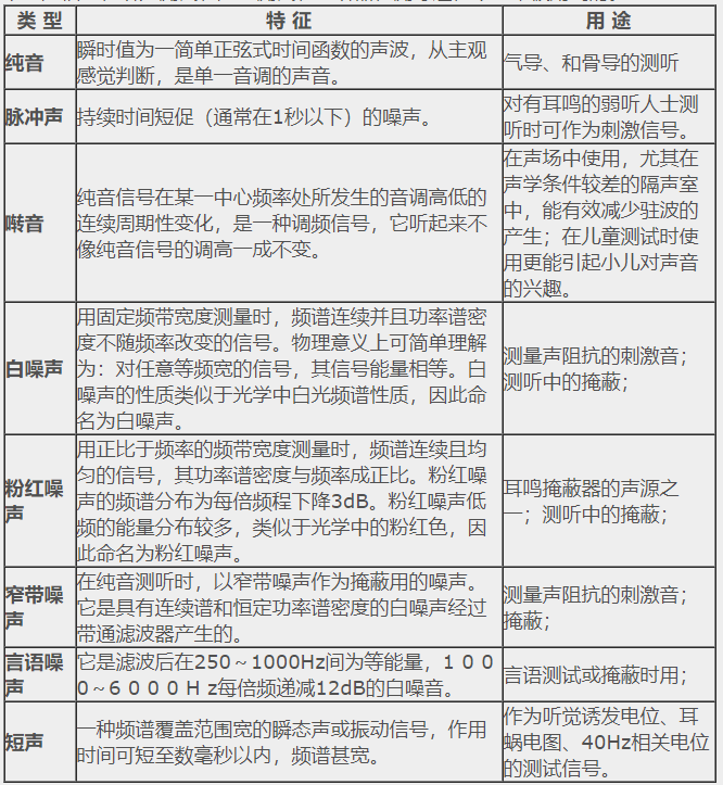 1. 描述聲波的常見物理量</p><p> 1)頻率:單位時間內物體振動的次數(次/秒),用Hz表示;</p><p> 2)強度和振幅:振幅是描述物體振動時傳遞能量的大小,單位是分貝dB;</p><p> 3)分貝:人耳的聽聲范圍太大,引起聽閾的最小聲強與引起痛覺的最小聲強相差近100萬倍,不易計數,因此以某一絕對聲強為基準(20μPa),將聲強的絕對值轉換為與該基準聲強的比值(聲強的級),再取以10為底的對數,最終計數單位變成了貝爾(Bell),為了更細的分級,現在普遍采用1/10B,即分貝(dB)為計數單位。</p><p> </p><center><img alt="" src="/upfiles/201906100126248309.png" width="423" height="154" /></center><p></p><p style="text-align: center;">音波示意圖</p><p style="text-align: left;"> 4)相位:指聲源相對于聽者的方向或位置,當頻率相同的聲音同時到達某點時,如果相位相同,其結果是使聲音顯得更響;當聲音一前一后分別到達時,相位出現部分抵消,其結果是使聲音顯得更輕,相位是確定聲源位置的依據;</p><p> 5)聲壓級(SPL):是用對數級的辦法來表示聲壓的相對大小,單位是dB SPL。計算公式為Lp(SPL)=20lg(P/P0),P0為基準聲壓,在空氣中取人耳1000Hz處能聽到的最小聲壓20μPa。</p><p> 2. 聽力學中常用的聲音信號</p><p> 下列聲信號在聽力測試、聲場測試、助聽器檢測等過程中經常被用到的。</p><p> </p><center><img alt="" src="/upfiles/201906100126317113.png" width="554" height="600" /></center><p></p><p> 更多詳情請登錄聽覺有道助聽器m.hnghng.cn</p>" />