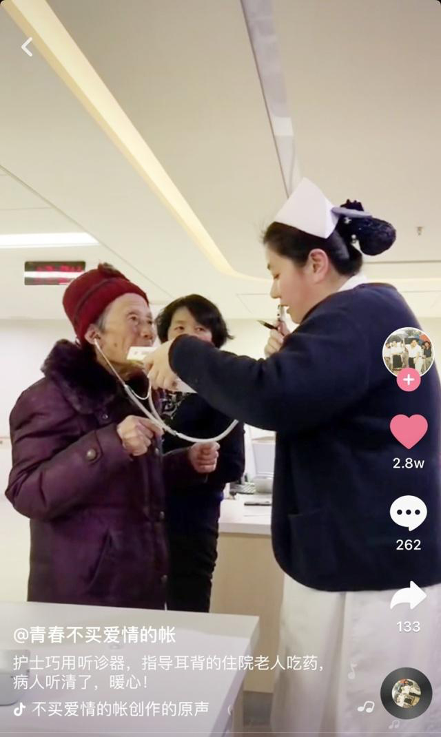 <span style="white-space:pre"> </span>“一天吃幾個(gè)呀?”<br /><br /> “一天三次,一次兩顆!”<br /><br /> “哦,一天三次,哦哦。”<br /><br /> 短短的三句話,15秒。<br /><br /> 一條護(hù)士用聽(tīng)診器當(dāng)“臨時(shí)助聽(tīng)器”,為一位耳背老奶奶講解用藥方法的抖音視頻在網(wǎng)上熱傳。<br /><br /> 視頻中的老奶奶是住在醫(yī)院的79歲老人,有點(diǎn)耳背,用聽(tīng)診器說(shuō)話的是護(hù)士黃艷,拍攝者是另一位護(hù)士蔣夢(mèng)婷。當(dāng)時(shí),老奶奶不知怎么吃藥,小黃喊了半天,奶奶也沒(méi)聽(tīng)清,于是靈機(jī)一動(dòng),就把聽(tīng)診器用上了。一旁的小蔣順手就把視頻分享到微信朋友圈里。<br /><br /> 友好醫(yī)院工作人員把這段視頻做成一條抖音視頻,以網(wǎng)名“青春不買愛(ài)情的帳”發(fā)送。“青春不買愛(ài)情的帳”說(shuō),本來(lái)就想與同事和朋友分享一下醫(yī)院護(hù)士既機(jī)智又暖心的行為,沒(méi)想到僅一天的工夫,竟獲百萬(wàn)點(diǎn)擊量,數(shù)萬(wàn)個(gè)贊。<br /><br /> “看到節(jié)節(jié)飆升的點(diǎn)擊量,我非常激動(dòng)。”“青春不買愛(ài)情的帳”說(shuō),可以看出人們對(duì)醫(yī)護(hù)人員這個(gè)行業(yè)的關(guān)注。<br /><br /> “我們對(duì)老人一個(gè)小小的關(guān)愛(ài)行為,竟引起網(wǎng)友的強(qiáng)烈反響,可以看到我們社會(huì)充滿愛(ài)。”<br /><br /> 除了熱情點(diǎn)贊,還有不少網(wǎng)友發(fā)表了評(píng)論。<br /><br /> “給這個(gè)職業(yè)的工作者點(diǎn)贊,她們的真的很偉大,也很不容易?!?lt;br /><br /> “最美護(hù)士!”<br /><br /> “太贊了,真是暖心一幕。”<br /><br /> “這個(gè)職業(yè)工作者不容易,為這個(gè)護(hù)士姐姐點(diǎn)贊?!?lt;br /><br /> 還有的網(wǎng)友打趣,表示學(xué)到了一招:“太有才了,聽(tīng)診器開(kāi)發(fā)出新用途。”<br /><br /></span><p><span style="font-size:16px;"> “對(duì)這個(gè)可以。心臟不好的聽(tīng)心臟;肺不好了聽(tīng)肺;嗓子不好了,可以當(dāng)喇叭使;耳朵不好了可以當(dāng)助聽(tīng)器。”</span></p><p style="text-align: center;"><span style="font-size:16px;"><img src="/upfiles/201907240350126074.jpg" alt="" /><br /></span></p>" />