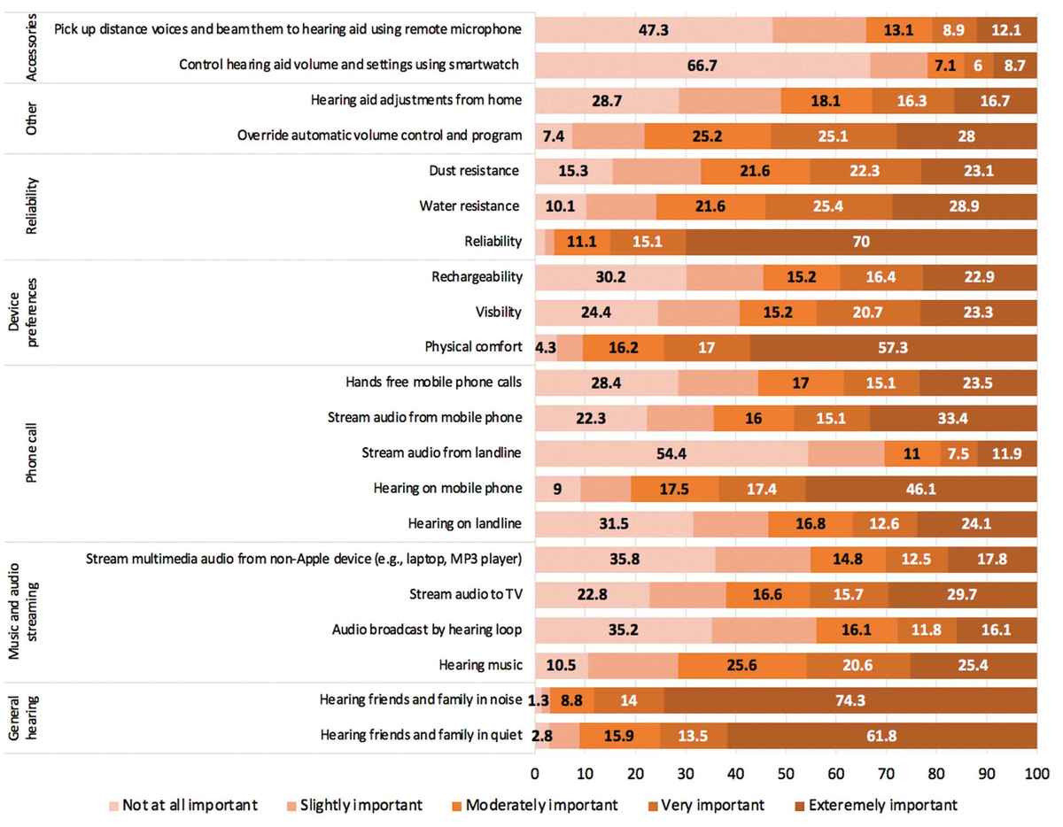 <span style="white-space:pre"> </span>助聽器用戶最關(guān)注的助聽器問題是什么呢?<br /><br /></span><p><span style="font-size:16px;"> 近兩年來,美國HearingTracker網(wǎng)站征集了上萬名助聽器使用者的意見,得到較為客觀的反饋數(shù)據(jù)。</span></p><p><span style="font-size:16px;"><br /></span></p><p style="text-align: center;"><span style="font-size:16px;"><img src="/upfiles/202109180411392952.jpg" width="640" alt="" /><br /></span></p><p style="text-align: center;"><span style="font-size:16px;"><br /></span></p><span style="font-size:16px;"> <strong>助聽器用戶最在意的:</strong><br /><br /> 噪聲環(huán)境下的清晰度<br /><br /> 設(shè)備可靠性<br /><br /> 安靜環(huán)境下的清晰度<br /><br /> 佩戴舒適度<br /><br /> <strong>助聽器用戶最不在意的:</strong><br /><br /> 智能手表控制<br /><br /> 固定電話流<br /><br /> 接收遠(yuǎn)處聲音的拓展性<br /></span><p><span style="font-size:16px;"> 聽覺環(huán)路</span></p><p><span style="font-size:16px;"><br /></span></p><p style="text-align: center;"><span style="font-size:16px;"><img src="/upfiles/202109180412136016.jpg" width="640" alt="" /><br /></span></p><div style="text-align: center;"><span style="font-size:16px;"> Data from HearingTracker's consumer survey,as analyzed by Vinaya Manchaiah and Erin Picou.</span></div><div style="text-align: center;"><span style="font-size:16px;"><br /></span></div><span style="font-size:16px;"><br /> 這個(gè)調(diào)查結(jié)果,也許并不出人意料。<br /><br /> 助聽器用戶們最關(guān)注的是在噪聲環(huán)境下的清晰度,其次是設(shè)備可靠性、安靜環(huán)境下的清晰度和佩戴舒適度。<br /><br /> 盡管近15%的人認(rèn)為通過智能手表來控制助聽器音量的功能是非常/極為重要的,但66.7%的人覺得沒什么必要。<br /><br /></span><p><span style="font-size:16px;"> 51.3%的用戶希望能夠在家調(diào)試自己的助聽器,而不必耗費(fèi)時(shí)間和精力到線下的醫(yī)院或驗(yàn)配中心。</span></p><p><span style="font-size:16px;"><br /></span></p><p style="text-align: center;"><span style="font-size:16px;"><img src="/upfiles/202109180412599513.jpg" width="640" alt="" /><br /></span></p><p style="text-align: center;"><span style="font-size:16px;"><br /></span></p><span style="font-size:16px;"> 超過90%的助聽器用戶認(rèn)為,戴上助聽器,無論是在噪聲環(huán)境還是安靜環(huán)境下,是否能聽清親友的聲音,都非常重要,尤其在噪聲環(huán)境。<br /><br /> 對于近幾年來火熱的無線連接功能,調(diào)查發(fā)現(xiàn):當(dāng)用戶熟悉使用這個(gè)功能后,會(huì)成為它的忠實(shí)粉絲。<br /><br /> 大多數(shù)用戶希望助聽器能夠支持手機(jī)通話,對支持使用固定電話的需求較少。<br /><br /> 70%以上的用戶希望助聽器能夠支持聽音樂,約62%的用戶希望通過音頻直傳連接電視。<br /><br /></span><p><span style="font-size:16px;"> 67%的用戶認(rèn)為助聽器的防塵性是重要的,75.9%的用戶認(rèn)為助聽器的防水性是重要的。</span></p><p><span style="font-size:16px;"><br /></span></p><p style="text-align: center;"><span style="font-size:16px;"><img src="/upfiles/202109180413225493.jpg" width="640" alt="" /><br /></span></p><p style="text-align: center;"><span style="font-size:16px;"><br /></span></p><span style="font-size:16px;"> 助聽器的可靠性(安全耐用)始終是用戶關(guān)心的重要話題,關(guān)注程度遠(yuǎn)超隱蔽性、可充電性。<br /><br /> 當(dāng)今世界助聽器技術(shù)發(fā)展,勢必要為所有的助聽器用戶著想,所以更側(cè)重于上面用戶關(guān)注度排在前列的技術(shù)發(fā)展鉆研。但這對小部分人來說,并不是一件很酷的事。<br /><br /> 參考:HearingTracker網(wǎng)站,聽力行業(yè)通訊<br /><br /> 調(diào)查結(jié)果可能會(huì)受地域與文化影響而有所差異,但有一定的參考價(jià)值</span>" />