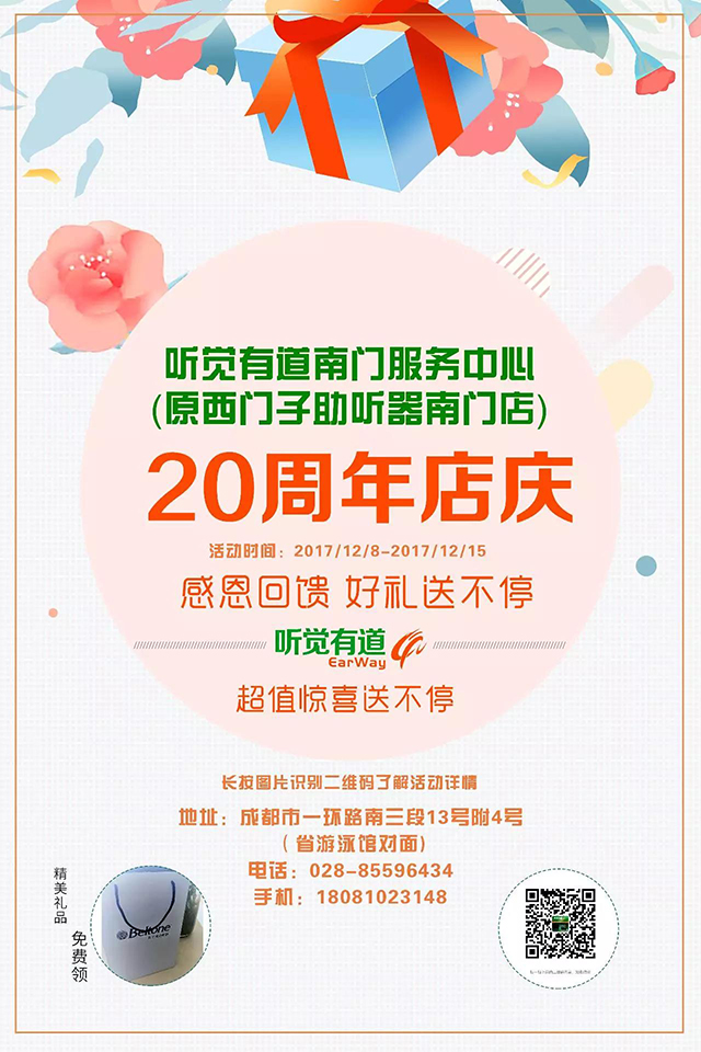 2017年12月8日,聽覺有道成都南門服務中心(原悅耳聽覺成都南門中心)20周歲啦!