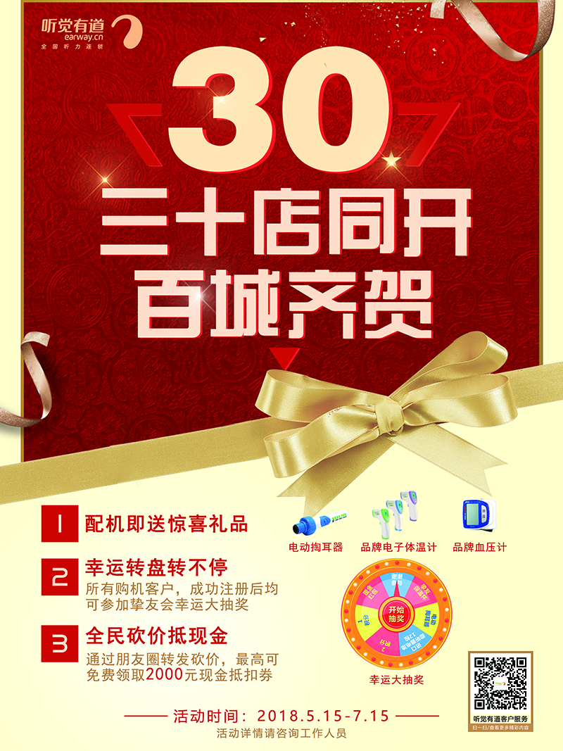 <span style="font-size:16px;"><img src="/upfiles/201805140533309372.jpg" alt="" /><br /></span></p><p style="text-align: center;"><span style="font-size:16px;"><br /></span></p><p><span style="font-size:16px;"> 聽覺有道助聽器驗(yàn)配中心30家門店于5月15日正式開業(yè),百城同慶!</span></p><p><span style="font-size:16px;"> 聽覺有道是一家高端、專業(yè)的全國聽力連鎖機(jī)構(gòu),有著近30年的助聽器驗(yàn)配經(jīng)驗(yàn),是廣東聽覺有道企業(yè)管理有限公司旗下品牌。</span></p><p><span style="font-size:16px;"> 公司現(xiàn)有專家級驗(yàn)配師400多名,驗(yàn)配服務(wù)中心遍布華西、華東、華南、華北主要省市,同時(shí)與GN集團(tuán)進(jìn)行戰(zhàn)略合作,代理美國貝爾通助聽器等助聽器品牌,擁有多條產(chǎn)品線:聽力篩查聽力篩查,聽力診斷,平衡診斷,助聽器驗(yàn)配及專家級軟件(聽力診斷設(shè)備操作系統(tǒng)與患者信息服務(wù)管理系統(tǒng)),行業(yè)內(nèi)領(lǐng)先的無線藍(lán)牙助聽器通訊技術(shù),為聽障朋友提供一站式助聽器驗(yàn)配解決方案!</span></p><p><span style="font-size:16px;"> 作為助聽器驗(yàn)配行業(yè)的專業(yè)服務(wù)者,專業(yè)的驗(yàn)配環(huán)境,專家級的驗(yàn)配師,將時(shí)刻秉承專業(yè)全面的服務(wù)、豐富的驗(yàn)配經(jīng)驗(yàn)及先進(jìn)的驗(yàn)配設(shè)備,同時(shí)為聽障朋友提供康復(fù)指導(dǎo)及助聽器售后服務(wù),讓聽障朋友更好更放心地傾聽!</span></p><p style="text-align: center;"><span style="font-size:16px;"> <strong>我們的新門店地址(30家):</strong></span></p><p><span style="font-size:16px;"></span></p><p></p><p style="text-align: center;"><span style="font-size:16px;"> <strong>聽覺有道華南高端驗(yàn)配中心</strong></span></p><p style="text-align: center;"><span style="font-size:16px;"><strong><img src="/upfiles/201805151039587785.png" alt="" /><br /></strong></span></p><p style="text-align: center;"><span style="font-size:16px;"> 電話:020-87066099</span></p><p style="text-align: center;"><span style="font-size:16px;"> 地址:廣州市天河區(qū)體育東路122號羊城國際商貿(mào)中心西塔1108(地鐵體育中心B出口前行100米,專家坐診,只接受預(yù)約)</span></p><p style="text-align: center;"><span style="font-size:16px;"><br /></span></p><p style="text-align: center;"><span style="font-size:16px;"> <strong>聽覺有道內(nèi)蒙古呼市烏蘭察布服務(wù)中心</strong></span></p><p style="text-align: center;"><span style="font-size:16px;"><strong><img src="/upfiles/201805151040168591.png" alt="" /><br /></strong></span></p><p style="text-align: center;"><span style="font-size:16px;"> 電話:0471-3977839、13514714042</span></p><p style="text-align: center;"><span style="font-size:16px;"> 地址:內(nèi)蒙古呼和浩特市賽罕區(qū)烏蘭察布東街路北(招商考試中心旁)</span></p><p style="text-align: center;"><span style="font-size:16px;"><br /></span></p><p style="text-align: center;"><span style="font-size:16px;"> <strong>聽覺有道成都金堂服務(wù)中心</strong></span></p><p style="text-align: center;"><span style="font-size:16px;"><strong><img src="/upfiles/201805151040458276.png" width="500" alt="" /><br /></strong></span></p><p style="text-align: center;"><span style="font-size:16px;"> 電話:17780478558</span></p><p style="text-align: center;"><span style="font-size:16px;"> 地址:成都市金堂縣趙鎮(zhèn)十里大道300號(一橫道路口)</span></p><p style="text-align: center;"><span style="font-size:16px;"><br /></span></p><p style="text-align: center;"><span style="font-size:16px;"> <strong>聽覺有道四川雅安服務(wù)中心</strong></span></p><p style="text-align: center;"><span style="font-size:16px;"><strong><img src="/upfiles/201805151041171639.png" alt="" /><br /></strong></span></p><p style="text-align: center;"><span style="font-size:16px;"> 電話:17738307596</span></p><p style="text-align: center;"><span style="font-size:16px;"> 地址:雅安市雨城區(qū)大南街22號(天主教堂對面)</span></p><p style="text-align: center;"><span style="font-size:16px;"><br /></span></p><p style="text-align: center;"><span style="font-size:16px;"></span></p><p style="text-align: center;"><span style="font-size: 16px;"> <strong>聽覺有道東營廣饒服務(wù)中心</strong></span></p><p style="text-align: center;"><span style="font-size: 16px;"><strong><img src="http://m.hnghng.cn/upfiles/20180515104347120.png" alt="" /><br /></strong></span></p><p style="text-align: center;"><span style="font-size: 16px;"> 電話:0546-6281512</span></p><p style="text-align: center;"><span style="font-size: 16px;"> 地址:東營市廣饒縣花苑路與兵圣路十字路口東行20米路北(醫(yī)藥公司對面)</span></p><p style="text-align: center;"><span style="font-size: 16px;"><br /></span></p><p style="text-align: center;"><span style="font-size: 16px;"> <strong>聽覺有道河南洛陽服務(wù)中心</strong></span></p><p style="text-align: center;"><span style="font-size: 16px;"><strong><img src="http://m.hnghng.cn/upfiles/201805151044003400.png" alt="" /><br /></strong></span></p><p style="text-align: center;"><span style="font-size: 16px;"> 電話:0379-64324338、16637990858</span></p><p style="text-align: center;"><span style="font-size: 16px;"> 地址:河南省洛陽市澗西區(qū)景華路8號(潤峰廣場正對面)</span></p><p style="text-align: center;"><span style="font-size: 16px;"><br /></span></p><p style="text-align: center;"><span style="font-size: 16px;"> <strong>聽覺有道山東聊城服務(wù)中心</strong></span></p><p style="text-align: center;"><span style="font-size: 16px;"><strong><img src="http://m.hnghng.cn/upfiles/201805151044136324.png" alt="" /><br /></strong></span></p><
