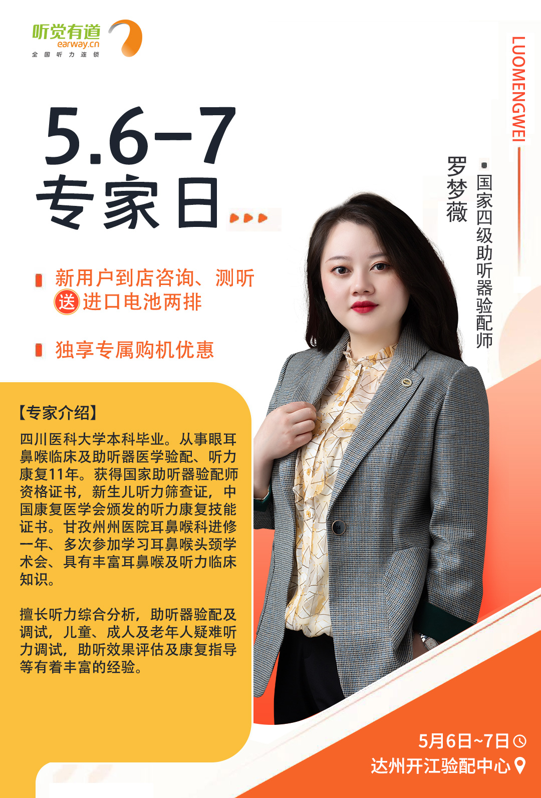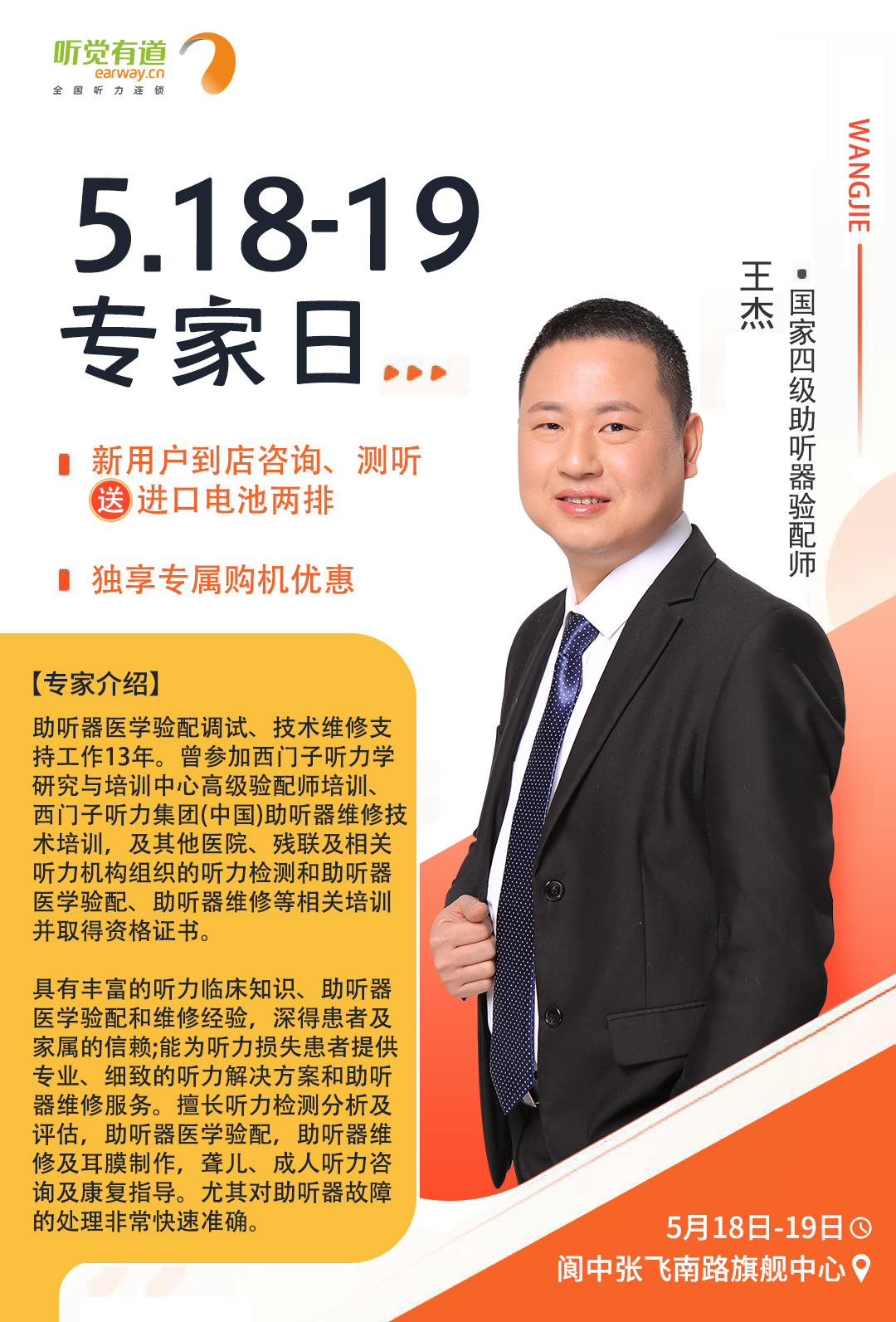 <span style="white-space:pre"> </span>為了更好地服務(wù)聽損人士,帶來高質(zhì)量的聆聽感受,聽覺有道全國聽力連鎖將持續(xù)開展專家入店活動。<br /></span><p><span style="font-size:16px;"> 專家日現(xiàn)場,聽覺有道金牌聽力專家將為您解答聽力相關(guān)問題,調(diào)試和驗配助聽器,讓您能夠更好地聆聽這個世界的美好。</span></p><p style="text-align: center;"><img src="/upfiles/202104300114022603.jpg" width="640" alt="" /><br /></p><p style="text-align: center;"><br /></p><span style="font-size:16px;"> <strong>活動預(yù)告<br /><br /> 聽覺有道專家入店行程表</strong><br /><br /> 聽覺有道東莞塘廈驗配中心<br /> 時間:5月2日<br /> 專家:李冬根<br /> 電話:0769-87927386<br /> 手機(jī):18923091281<br /> 地址:廣東省東莞市塘廈鎮(zhèn)塘廈大道中70-108號(水電三局對面)<br /><br /> 聽覺有道達(dá)州開江驗配中心<br /> 時間:5月6日~7日<br /> 專家:羅夢薇<br /> 電話:0818-8222079<br /> 手機(jī):19182813889<br /> 地址:四川省達(dá)州市開江縣新寧鎮(zhèn)龍池街77號(開江縣人民醫(yī)院正門對面)<br /><br /> 聽覺有道成都邛崍驗配中心<br /> 時間:5月6日~7日<br /> 專家:王蕾<br /> 電話:028-88734181<br /> 手機(jī):18908177682<br /> 地址:四川省邛崍市鳳凰大道484號高宇南庭(醫(yī)療中心醫(yī)院對面)<br /><br /></span><span style="white-space:pre"><span style="font-size:16px;"> 聽覺有道閬中張飛南路旗艦中心<br /> 時間:5月18日~19日<br /> 專家:王杰<br /> 電話:0817-6250177<br /> 手機(jī):17398130629<br /></span></span><p><span style="white-space:pre"><span style="font-size:16px;"> 地址:四川省閬中市張飛南路126號(人民醫(yī)院正對面)</span></span></p><p style="text-align: center;"><img src="/upfiles/202104300134599048.jpg" width="640" alt="" /> <img src="/upfiles/202104300134592952.jpg" width="640" alt="" /> <img src="/upfiles/202104300134592080.jpg" width="640" alt="" /><br /></p><p style="text-align: center;"><img src="/upfiles/202104300135382254.jpg" width="640" alt="" /><br /></p><p style="text-align: center;"><br /></p>" />